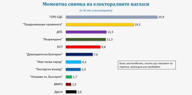 Ако изборите бяха в първата десетдневка на септември, ГЕРБ-СДС биха получили 25,9% от потенциалните гласове, „Продължаваме промяната” – 19,2%. Тези две формации са в главната битка в тази кампания и подредбата им ще зависи от степента, в която ПП успее или не успее да мобилизира привържениците, с които разполага, да гласуват. ГЕРБ от своя страна изглеждат в достатъчна степен консолидирани, макар видимо да не растат.