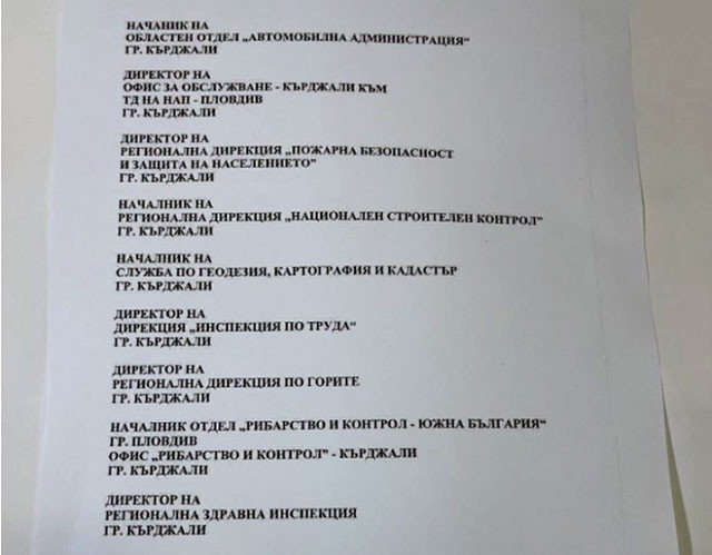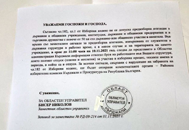ГЕРБ и областният координатор на партията в Кърджали Цвета Караянчева сигнализират за „лов на вещици“ в града в навечерието на изборите. Заместник-областният управител Бисер Николов изисквал неправомерно от държавните структури в града информация за техни служители, ангажирани в изборната кампания. Тя цитира писмо до директорите на 19 институции /сред които РЗИ, РЗОК, Държавен фонд „Земеделие“, Социално подпомагане, Регионалното управление по образование и др./, в което Николов е поискал в спешен порядък да му предоставят списъци с имената на хората, които са в отпуск за участие в изборите.