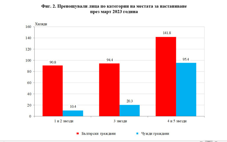 През март 2023 г., пренощувалите лица в местата за настаняване увеличават с 31.9% спрямо март 2022 г., достигайки 453.1 хиляди. Увеличението е със съответно 33.7% за чуждите граждани и 31.2% за българските граждани. Българските граждани, нощували в местата за настаняване, са 327.1 хил. и са реализирали средно по 2.1 нощувки, а чуждите граждани - 126.0 хил., със средно по 2.8 нощувки. 75.7% от тях са нощували в хотели с 4 и 5 звезди.