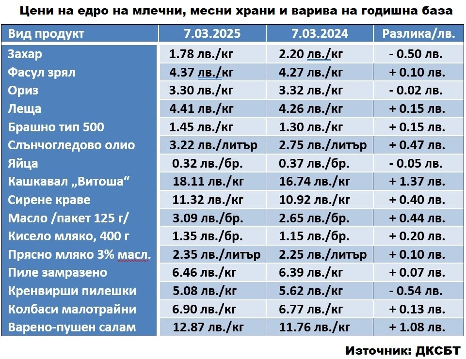 От таблицата по-горе е видно, че на годишна база при млечните, месните храни и варивата поскъпналите са значително повече. Най-много се е повишила цената на кашкавала "Витоша" (+1.37 лева), следван от трайния варено-пушен салам (+1.08 лева), слънчогледовото олио (+0.47 лева), пакетчето масло 125 грама (+0.44 лева), краве сирене (+0.40 лева). Най-много е спаднала цената на пилешките кренвирши (-0.54 лева), следвани от захарта (-0.50 лева), яйцата (-0.05 лева).