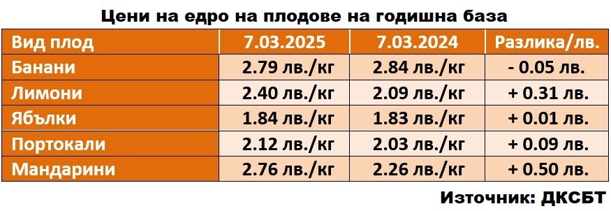 От таблицата по-горе е видно, че на годишна база повечето плодове са поскъпнали. Най-много е нараснала цената на мандарините (+0.50 лева), следвани от лимоните (+0.31 лева), портокалите (+0.09 лева). Поевтинели са само бананите (-0.05 лева).