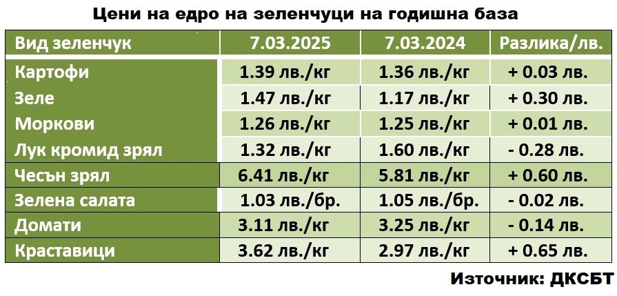 От таблицата по-горе е видно, че и на годишна база поскъпналите са повече, толкова са и поевтинелите зеленчуци. Най-много се е повишила цената на краставиците (+0.65 лева), следвани от зрелия чесън (+0.60 лева), зелето (+0.30 лева), зрелия кромид лук (+0.28 лева). Спаднала е цената на доматите (-0.14 лева) и на зелената салата (-0.02 лева)./Dir.bg