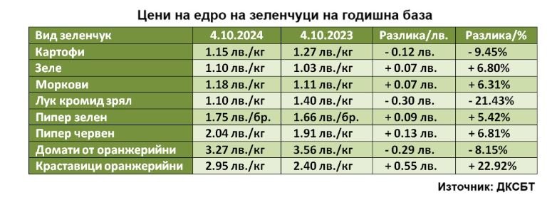 Най-много е спаднала цената на едро на оранжерийните краставици (-6.5% до 2.95 лв./кг), следвани от зелето (-0.5% до 1.10 лв./кг), картофите (-0.4% до 1.15 лв./кг), морковите (-0.4% до 1.18 лв./кг).