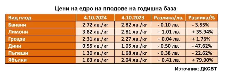 от всичките 18 продукти, включени в бюлетина на ДКСБТ, на седмична база поскъпналите са 12, поевтинелите са 6, като трендът е от минус 1.0% до плюс 2.5 на сто, което е нормално за сезона за тази група хранителни продукти.