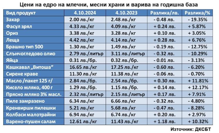 е спаднала спрямо предходната седмица при повечето от 10-те основни храни, които се наблюдават и съпоставят от ДКСБТ в 15 области на страната. Най-голяма е ценовата разлика от 10.65 лева при кашкавала "Витоша" (от 11.35 лв./кг в Благоевград до 22.00 лв./кг в Пловдив и София), следван от кравето сирене, при което разликата е 9.46 лева (от 5.54 лв./кг в Добрич до 15.00 лв./кг в Пловдив), 5.90 лева е разликата при каймата смес (от 5.00 лв./кг в Добрич до 10.90 лв./кг във Велико Търново), при зрелия фасул разликата е 2.50 лева (от 3.20 лв./кг в Благоевград, до 5.70 лв./кг във Велико Търново), 2.43 лева е разликата при замразеното пиле (от 5.80 лв./кг в Плевен до 8.23 лв./кг в Силистра), при ориза разликата е 2.34 лева (от 2.60 лв./кг във Враца и София до 4.94 лв./кг в Сливен), 1.35 лева е разликата при захарта (от 1.50 лв./кг в Хасково до 2.85 лв./кг в Смолян), при брашното тип 500 разликата е 1.33 лева (от 0.76 лв./кг във Враца до 2.09 лв./кг в Силистра), 0.99 лева е разликата при слънчогледовото олио (от 2.55 лв./литъра в Хасково до 3.54 лв./литъра в Силистра), при яйцата разликата е 0.08 лева (от 0.27 лв./броя в Кърджали, Плевен и Ловеч до 0.35 лв./броя в София).