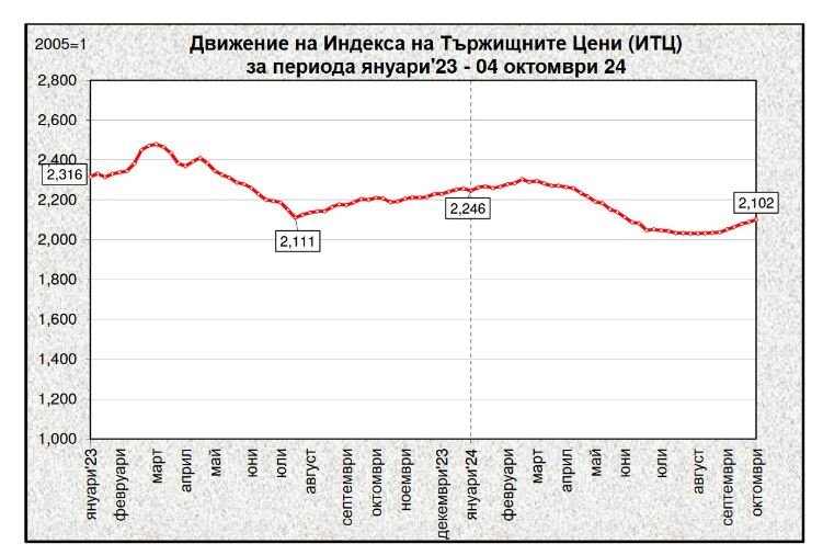 Индексът на тържищните цени на едро (ИТЦ), който се поддържа от ДКСБТ, към 4 октомври е 2.102 пункта спрямо 2.089 пункта към 27 септември или седмично повишение с 0.62%, след като в последната седмица на септември нарастването е с 0.48%.