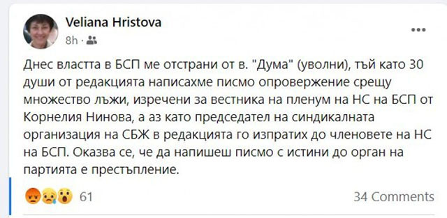 "Днес властта в БСП ме отстрани от в. "Дума" (уволни), тъй като 30 души от редакцията написахме писмо опровержение срещу множество лъжи, изречени за вестника на пленум на НС на БСП от Корнелия Нинова, а аз като председател на синдикалната организация на СБЖ в редакцията го изпратих до членовете на НС на БСП. Оказва се, че да напишеш писмо с истини до орган на партията е престъпление", обяви уволнената Христова.