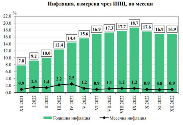Инфлацията в България за втори пореден месец остава на едно и също ниво. През декември и ноември годишният ръст на цените е бил 16.9%, докато през октомври инфлацията е достигнала 17.6 на сто. През първите 9 месеца на годината инфлацията не спираше да се увеличава като от 7.3% през януари достигна невижданите от 24 години насам 18.7% през септември.