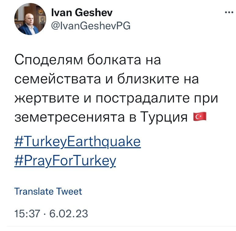 „Споделям болката на семействата и близките на жертвите и пострадалите при земетресението в Турция”. Това написа във „Туитър” главният прокурор Иван Гешев.