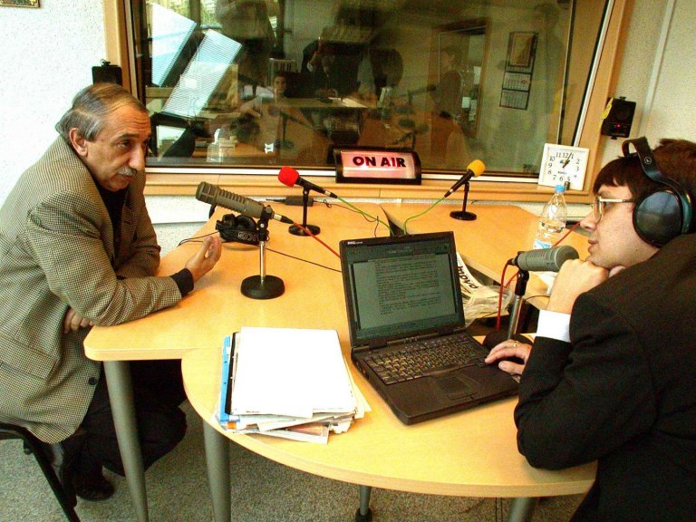 11 май 2002 г., София. Кеворкян e гост на "Дарик" радио след възстановеното предаване "Всяка неделя". На снимката: Водещият Кирил Вълчев (вдясно) с Кеворк Кеворкян в студиото. Снимка: Тихомир Пенов/Архив на БТА