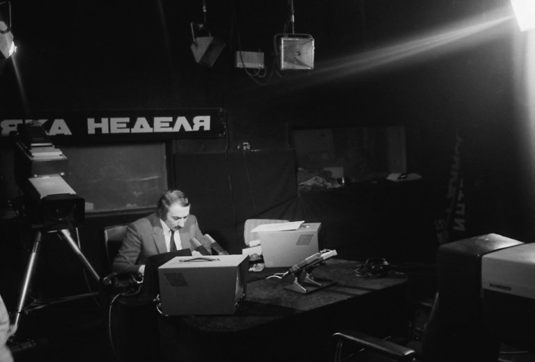 20 октомври 1986 г. В студиото на предаването "Всяка неделя" на Българска телевизия с водещ Кеворк Кеворкян. Снимка: Емил Иванов/Архив на БТА