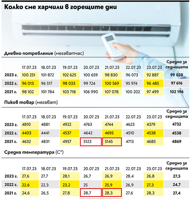От Електроенергийния системен оператор (ЕСО) казват, че 30-годишният летен рекорд в потреблението е бил през юли 2016 г., когато е стигнал 5200 мегавата. Близо до тези стойности е било потреблението през 2021 г. На 29 юли тогава пикът е 5123 мегавата, а на 30 юли - 5145. В тези два дни средната температура е била 28,7 и 28,3 градуса.