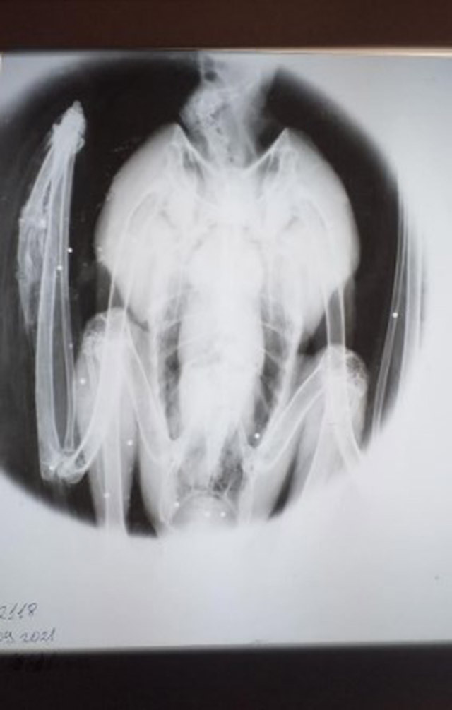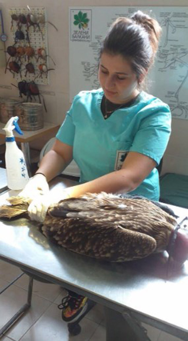 Птицата е настанена в Спасителния център за диви животни на "Зелени Балкани", а прегледът установява, че орелът е прострелян с ловно оръжие, със счупено ляво крило. Снимка с рентген установява 16 сачми в тялото му. Орелът безспорно е жертва на бракониери, убедени са от БДЗП.