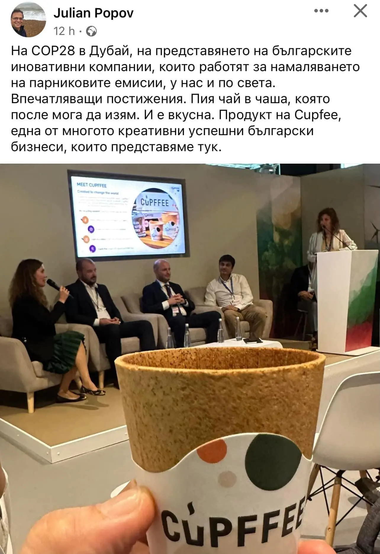 Министърът на околната среда и водите Юлиан Попов се похвали, че сладко си пие кафето в Дубай, а дори може и да си изяде чашата.