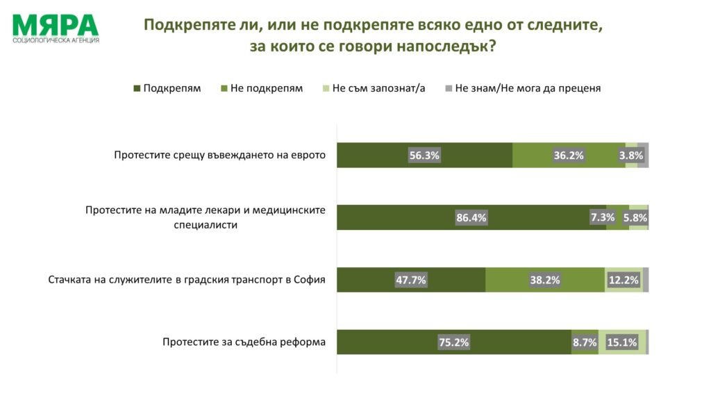 Протестите за съдебна реформа, например, също извикват автоматична подкрепа, макар и не на нивата по отношение на медиците. Подкрепят 75,2%, не подкрепят 8,7%, 15,1% отиват в "междинната" опция "не съм запознат" и това показва и степен на нееднозначност на оценката, а 1% не знаят какво да отговорят или не могат да преценят. Възможно е тук допълнителна роля да изиграва многогодишната принципна нагласа за недостатъчност на справедливост в обществото ни и традиционното недоверие към институциите, посочват анализаторите. И добавят, че затова и по отношение на съдебната реформа или пък младите лекари мненията са почти еднопосочни, докато при протестите срещу еврото, например, ярката политизация на темата е направила така, че се сблъскват два типа мнения. Нещо подобно се е случило и с политизацията в стачката в градския транспорт в София, отбелязват от социологическата агенция.
