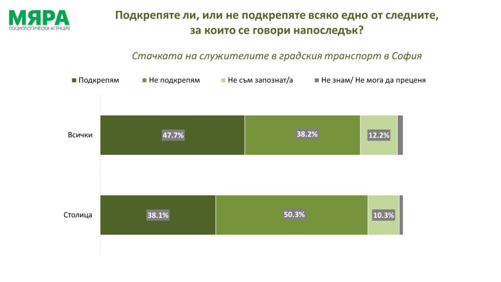 Любопитен е казусът със стачката в градския транспорт в София, коментират анализаторите и добавят, че в цялата страна тя по-скоро среща подкрепа, но в самата София е обратно - повечето мнения в столицата са срещу стачката. Националната картина е, че 47,7% подкрепят, 38,2% не подкрепят, 12,2% нямат достатъчно информация, за да формират мнение, а 1,9% не могат да отговорят. В София обаче картината е различна - 38,1% подкрепят, 50,3% не подкрепят, 10,3% нямат достатъчно информация, за да формират мнение, а 1,3% не могат да отговорят. Дали причините са от политическо естество, или са от естество, свързано с ежедневното удобство, но факт е, че мненията се разминават, коментират експертите.