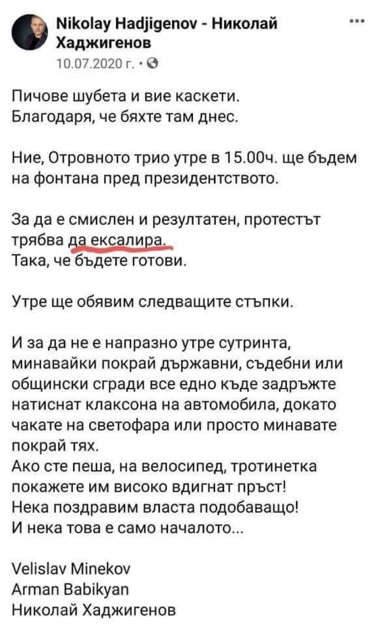 От постовете на Хаджигенов ясно се вижда, че в деня когато протестът от мирен се превърна в истински хаос и насилие, самият той призовава за ескалация.