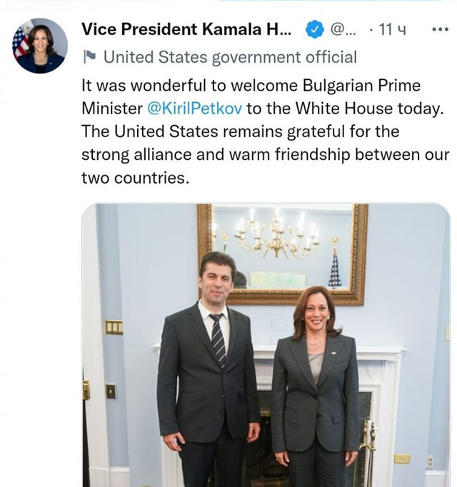 „Вицепрезидентът Камала Харис се срещна днес с министър-председателя на България Кирил Петков. Тя изрази своята признателност за силния съюз и топлото приятелство между САЩ и България. Тя благодари на министър-председателя за подкрепата на България към Украйна и потвърди солидарността на САЩ пред последния опит на Русия да използва енергията като оръжие. Те се съгласиха с необходимостта от укрепване на устойчивостта на Европа чрез по-нататъшно диверсифициране на енергийните доставки далеч от Русия и значението на продължаването на силната отбрана и възпирането по източния фланг на НАТО”. Това се посочва в официална позиция на Белия дом от срещата на премиера Петков с вицепремиера Камала Харис.