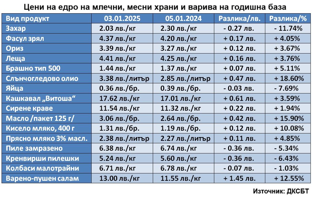 От таблицата по-горе е видно, че на годишна база при млечните, месните храни и варивата поскъпналите са повече. Най-много се е повишила цената на трайния варено-пушен салам (+1.45 лева), следван от кашкавала "Витоша" (+0.61 лева), слънчогледовото олио (+0.47 лева), пакетчето масло 125 грама (+0.42 лева), прясното мляко над 3% масленост (+0.20 лева), зрелия фасул (+0.17 левва).