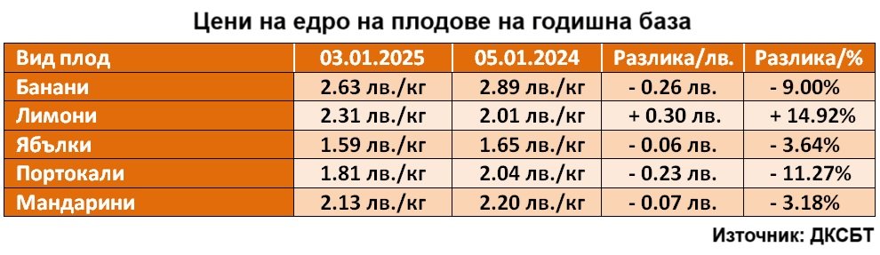 От таблицата по-горе е видно, че на годишна база повечето плодове са поевтинели. Най-много е спаднала цената на бананите (-0.26 лева), следвани от портокалите (-0.23 лева), мандарините (-0.07 лева), ябълките (-0.06 лева). Поскъпнали са само лимоните (+0.30 лева).