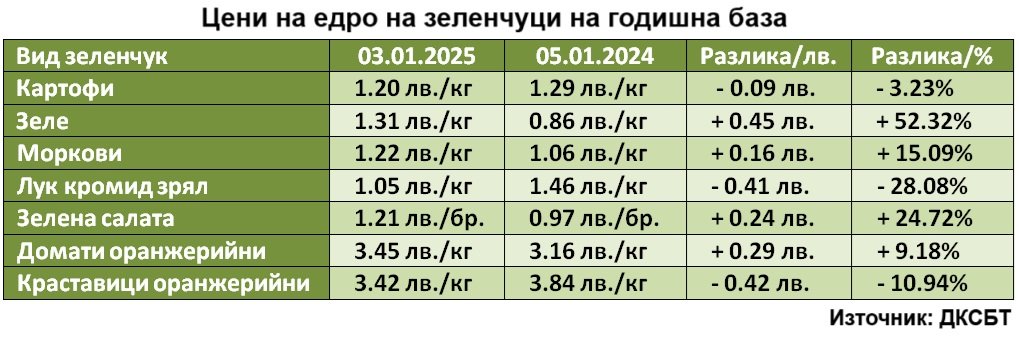 От таблицата по-горе е видно, че на годишна база повечето зеленчуци са поскъпнали. Най-много е нараснала цената на зелето (+0.45 лева), следвано от оранжерийните домати (+0.29 лева), зелената салата (+0.24 лева). Най-много са поевтинели оранжерийните краставици (-0.42 лева), следвани от зрелия кромид лук (-0.41 лева), картофите (-0.09 лева).