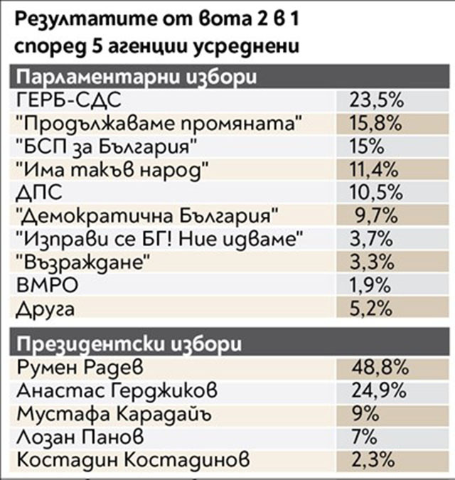 Според усреднените данни на 5 социологически агенции ГЕРБ - 22,9-24,1%, ПП - 14,8-16,5%, БСП - 12,1-16,7%