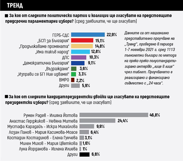 Социолозите са категорични, че правителство без “Продължаваме промяната” не може да има. От “Тренд” коментират, че е фатално важно кой ще спечели второто място - БСП или партията на Петков и Василев.