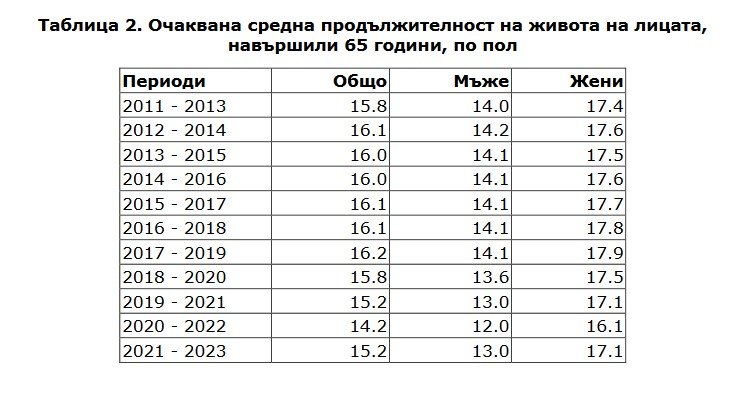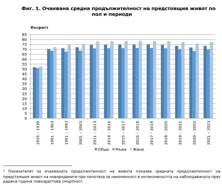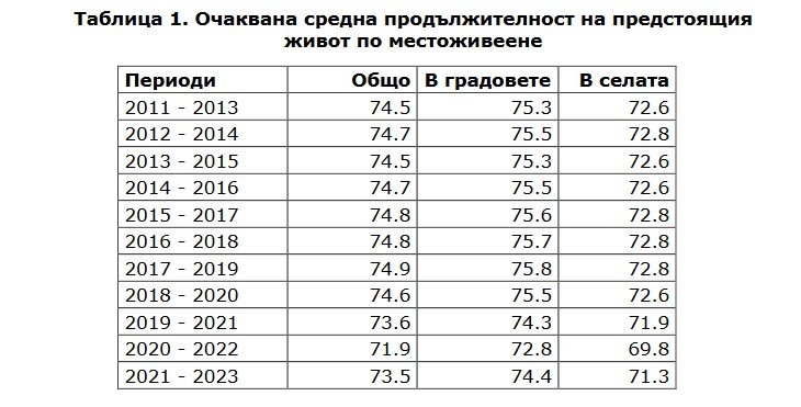 Очакваната средна продължителност на живота за населението на страната, изчислена за периода 2021 - 2023 г., е 73,5 години, сочат данните на НСИ. Спрямо предходния период (2020 - 2022 г.) продължителността на живота се увеличава с 1,6 години. Тя обаче остава по-ниска от предпандемичните години, когато е била над 74 години.