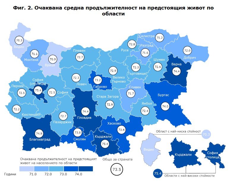 Очакваната продължителност на живота варира от 70,3 години в област Видин до 75,4 години в областите София (столица) и Кърджали. Жените живеят по-дълго от мъжете във всички области на страната, но най-голяма е разликата между двата пола в област Враца (8,5 години), а най-малка - в област Шумен (6,3 години).