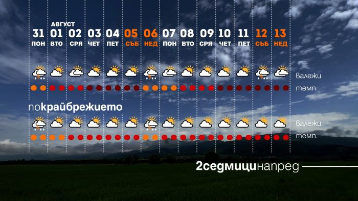 Август ще продължи с нова поредица слънчеви и сухи дни, като постепенно следобедните температури ще се върнат до интервала 30-35 градуса. Изгледи за неустойчивост с краткотрайни гръмотевични валежи има за 12-13 август, но с по-голяма вероятност в западната половина на страната.