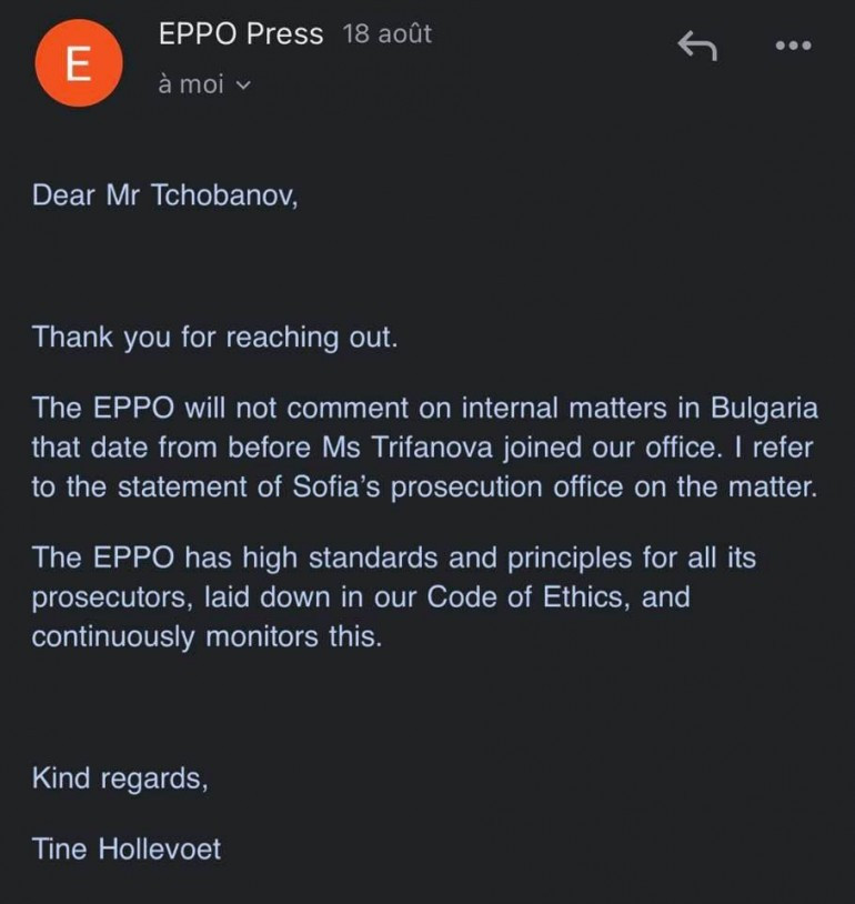 „Скъпи г-н Чобанов, Европейската прокуратура няма да коментира вътрешни за България въпроси, които датират от времето преди г-жа Трифонова да се присъедини към нашия офис. Позовавам се на изявлението на прокуратурата в София по този въпрос. Европейската прокуратура има високи стандарти и принципи за всички свои прокурори, залегнали в нашия Етичен кодекс, и ги следи непрекъснато“, гласи отговорът, подписан от Тине Холевоет – говорител на Европейската прокуратура, която преди това заемаше същия пост в Европол.
