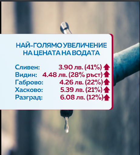 Областта с най-висока цена за кубик вода е Разград - шест лева и осем стотинки. Във Видин и Габрово скокът в цените е осезаем. Там гражданите ще трябва да плащат между 22 и 28% повече от миналата година. В Хасково цената за кубик вода ще скочи с един лев от днес. Общо седем са областите, в които гражданите ще плащат над пет лева за вода.