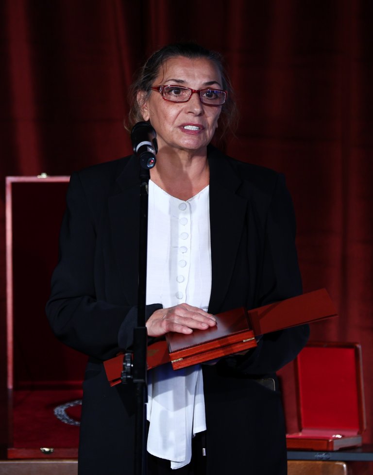 С награда на Министерството на културата „Златен век“ - звезда и Грамота за значим принос в развитието и утвърждаването на българската култура и национална идентичност и по повод 24 май, Деня на светите братя Кирил и Методий, на българската азбука, просвета и култура и на славянската книжовност е отличена Мария Траянова - режисьор и сценарист на над 40 документални филма (Снимка: Минко Чернев/БТА)