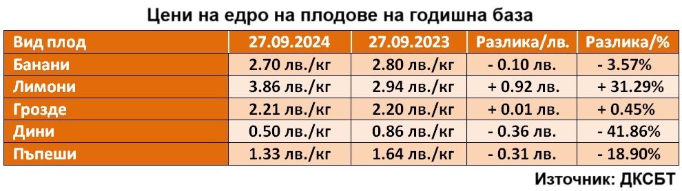 От таблицата по-горе е видно, че на годишна база поевтинелите са повече от поскъпналите. Най-много е спаднала цената на портокалите (-0.55 лева), следвани от ябълките (-0.45 лева), бананите (-0.18 лева), а са поскъпнали лимоните (+0.33 лева) и гроздето (+0.08 лева).