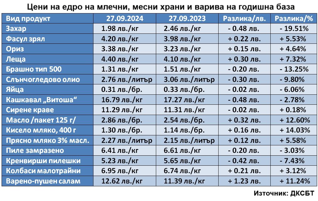e спаднала спрямо предходната седмица при повечето от 10-те основни храни, които се наблюдават и съпоставят от ДКСБТ в 15 области на страната. Най-голяма е ценовата разлика от 18.65 лева при кашкавала "Витоша" (от 11.35 лв./кг в Благоевград до 30.00 лв./кг в София), следван от кравето сирене, при което разликата е 11.86 лева (от 5.92 лв./кг в Добрич до 17.76 лв./кг в София), 5.90 лева е разликата при каймата смес (от 5.00 лв./кг в Добрич до 10.90 лв./кг във Велико Търново), при ориза разликата е 3.06 лева (от 2.00 лв./кг в Хасково до 5.06 лв./кг в Силистра), 2.46 лева е разликата при зрелия фасул (от 3.00 лв./кг в Шумен до 5.75 лв./кг в Силистра), при замразеното пиле разликата е 2.26 лева (от 6.00 лв./кг в Кърджали до 8.26 лв./кг в Силистра), 1.42 лева е разликата при захарта (от 1.43 лв./кг в Добрич до 2.65 лв./кг в Смолян), при брашното тип 500 разликата е 1.29 лева (от 0.76 лв./кг във Враца до 2.05 лв./кг в Пловдив), 1.15 лева е разликата при слънчогледовото олио (от 2.45 лв./литъра в Хасково до 3.60 лв./литъра в София), при яйцата разликата е 0.13 лева (от 0.24 лв./броя в Добрич до 0.37 лв./броя във Велико Търново и София).