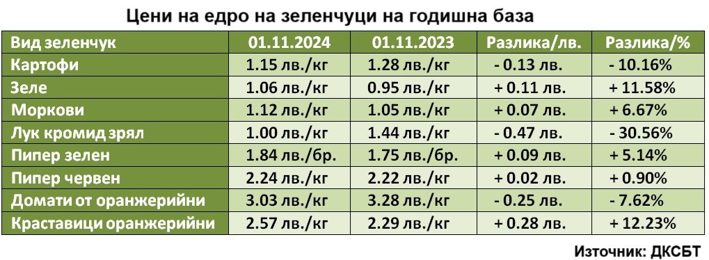 От таблицата по-горе е видно, че на годишна база повечето зеленчуци са поскъпнали. Най-много е нараснала цената на оранжерийните краставици (+0.28 лева), следвани от морковите (+0.27 лева), зелето (+0.21 лева). Най-много е поевтинял зрелият кромид лук (-0.22 лева), следван от оранжерийните домати (-0.11 лева), картофите (-0.10 лева).