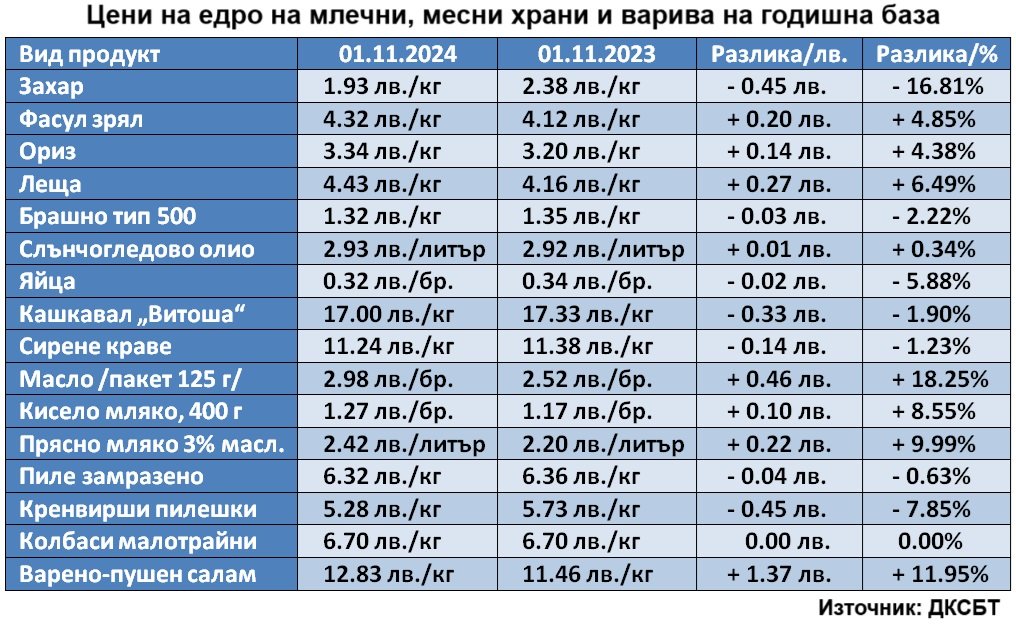От таблицата по-горе е видно, че на годишна база при млечните, месните храни и варивата поскъпналите са значително повече. Най-много се е повишила цената на трайния варено-пушен салам (+1.39 лева), следван от пакетчето масло 125 грама (+0.47 лева), слънчогледовото олио (+0.43 лева), а най-много е спаднала цената на пилешките кренвирши (-0.53 лева), следвани от захарта (-0.47 лева), кашкавала "Витоша" (-0.27 лева).