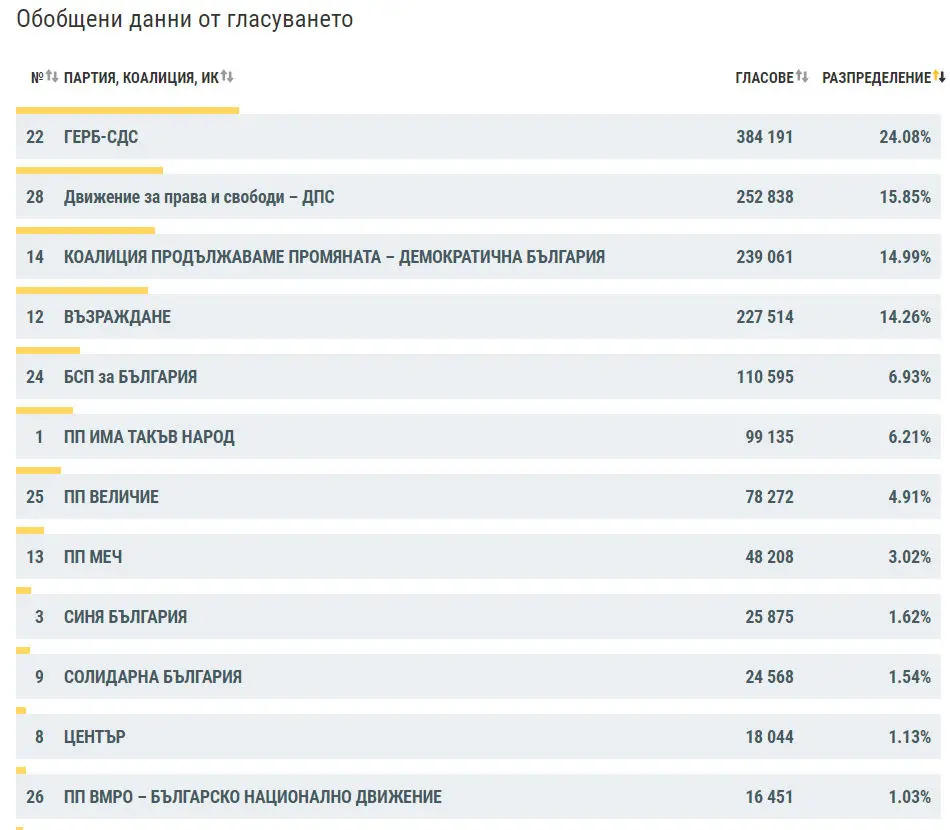 Според неокончателните резултати ГЕРБ запазва преднината си начело, ДПС трупа преднина пред ПП-ДБ и „Възраждане“, а „Величие“ остават над чертата за влизане в НС. Под чертата са ПП МЕЧ, Синя България и Солидарна България, а над единия процент, който гарантира партийна субсидия засега са и Център на Васил Божков и ВМРО.