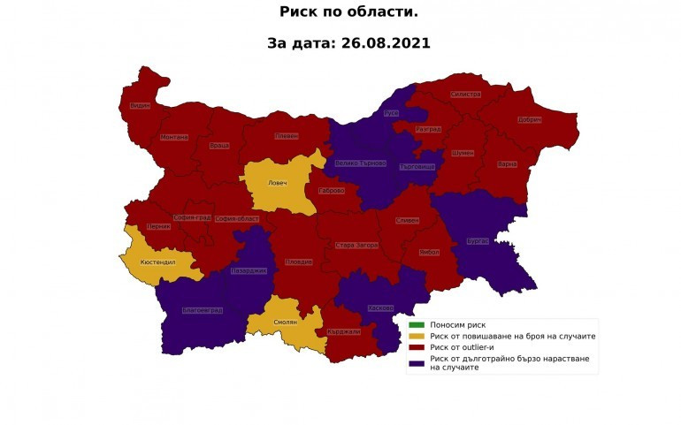 Следва картата на риска съгласно нашата методология. Виолетовото расте. Жълто почти не остана. Западна България беше в жълто и ви писах, че бавно ще почне да почервенява с наближаването на края на сезона по морето. Ами ето, това и става. Във Видин не знам дали панаирът свърши, но вече са в червената зона на риска. Вие, които следите тези сводки, знаете какво значи това и на кого какво ще се размине или няма да се размине.