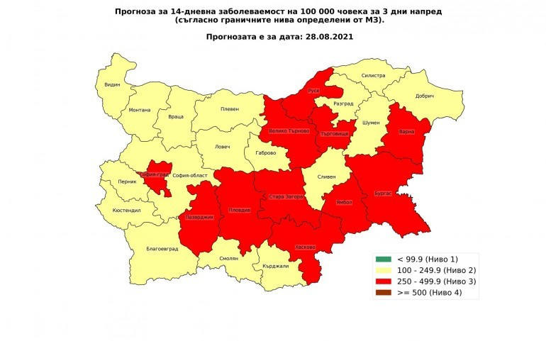 На картата за прогнозната 14-дневна заболеваемост нещата