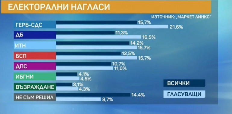 Проучване на „Маркет линкс“: ГЕРБ е първа политическа сила с 21,6%, ИТН и БСП с равни проценти