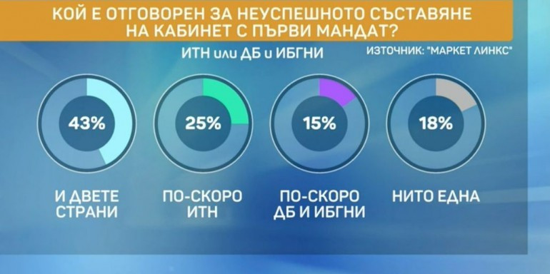 Проучване на „Маркет Линкс“ показва, че ГЕРБ е първа политическа, а партията на Слави Трифонов се изравнява с БСП и спада до цели 15.7%. Данните бяха представени от социолога Добромир Живков, който заяви, че най-голяма вина за невъзможността да се състави правителство понася именно партията на Слави Трифонов.
