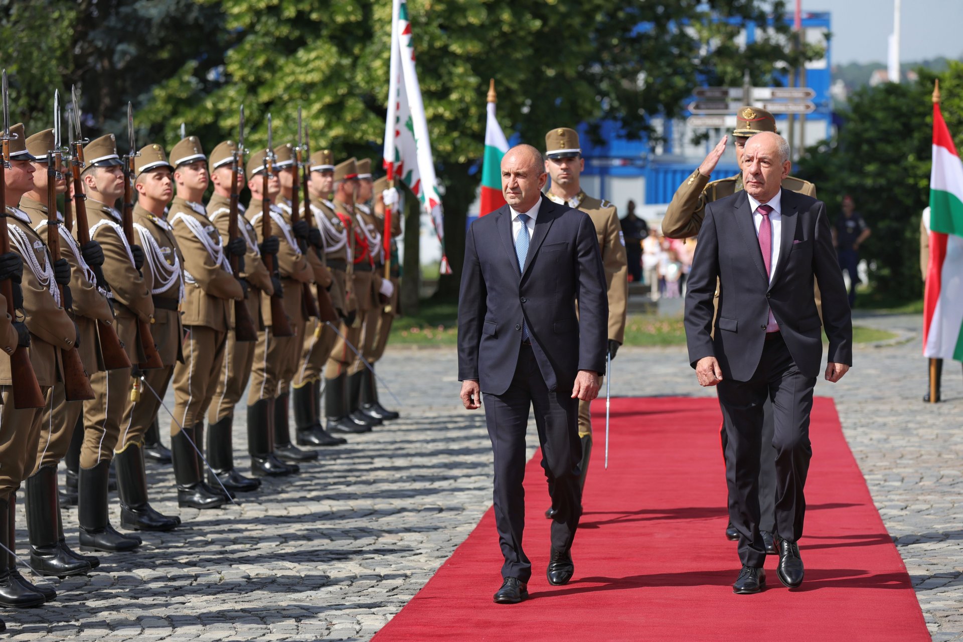 С официална церемония на площад "Св. Георги" пред президентския дворец в унгарската столица Будапеща държавният глава Румен Радев бе посрещнат от своя колега Тамаш Шуйок.