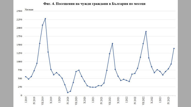 През юни 2023 г. е имало общо 1 392 100 посещенията на чужди граждани в България, което е с 23.0% повече в сравнение с юни 2022 година. Пътуванията им с цел почивка и екскурзия са се увеличили с 47.4%, докато пътуванията с причина "други" са се увеличили с 6.6%. Служебните такива пък са намалели с 1.5%. 30.9% от всички преминавания през България са били транзитни.