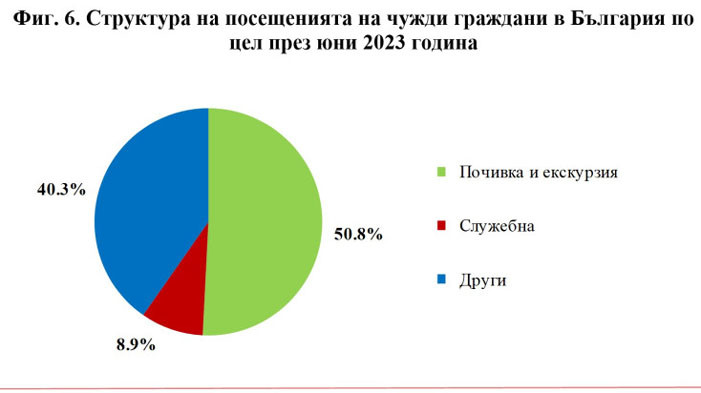 През юни 2023 г. преобладава делът на посещенията с цел почивка и екскурзия - 50.8%, следвани от посещенията с други цели - 40.3%, и със служебна цел - 8.9%.