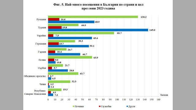 Най-много посещения в България са реализирали гражданите от: Румъния - 215 500., Турция - 208 800, Украйна - 166 800, Германия - 114 100, Гърция - 83 800, Полша - 83 700, Сърбия - 56 200, Обединено Кралство - 48 900, Чехия - 35 900, Република Северна Македония - 30 700.