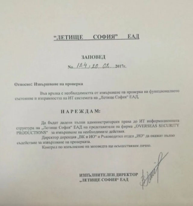 Според публикации в медиите на 20.02.2017 г. със заповед на изпълнителния директор на летище София е разпоредено да бъде даден пълен достъп до ITсистемата (и съответно информацията в нея) на никому неизвестната компания „Overseas security productions“. Това става само два дни след като служебното правителство сменя ръководството на „Летище София“ ЕАД и за шеф е назначен Пламен Станчев.