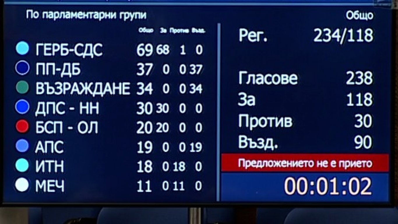 Снимка: БТА11:54 Кандидатът на ИТН Силви Кирилов събра 82 гласа подкрепа, а 36 народни представители от ПП-ДБ се въздържаха. 120 депутати гласуваха "против".