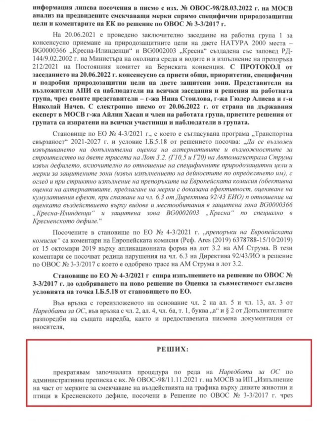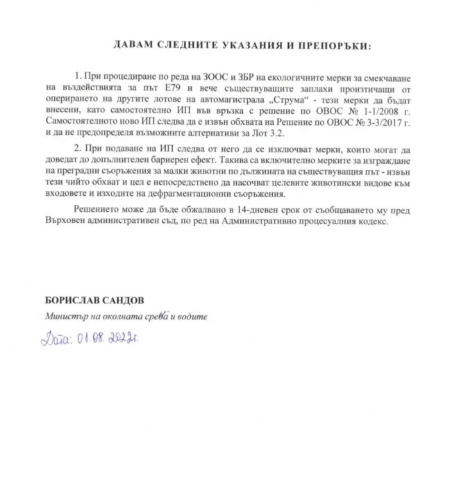 В последните минути като министър на екологията в оставка Борислав Сандов е спрял довършването на АМ „Струма“ през Кресненското дефиле, съобщава „Еко Новини“. Вчера в 17:00 часа Сандов е отменил всички предишни процедури по Оценка за въздействието върху околната среда, които даваха възможност на участъка да бъде завършен в обозримо бъдеще.