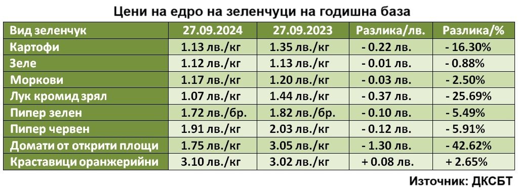 От таблицата по-горе е видно, че на годишна база повечето зеленчуци са поскъпнали. Най-много е нараснала цената на оранжерийните краставици (+0.84 лева), следвани от червения пипер (+0.22 лева), зеления пипер (+0.18 лева).